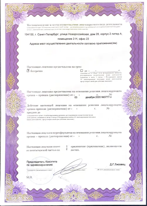 • Допуск, который даёт разрешение на осуществление медицинской деятельности в направлении наркологии и лечения зависимостей;